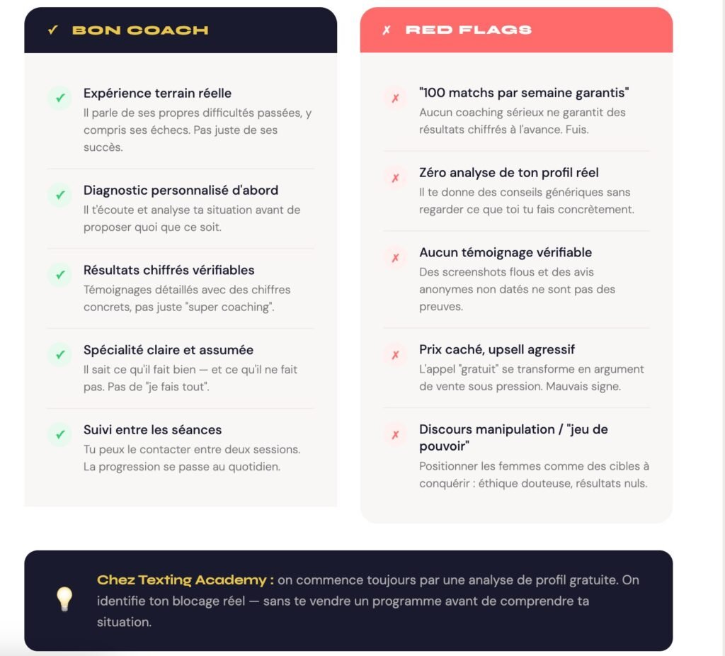 3. Travaille-t-il le text-game spécifiquement ? C’est le cœur du jeu sur les applis. Si le coaching ne couvre pas les openers, les relances, la façon de créer de l’attraction par écrit — il manque l’essentiel.